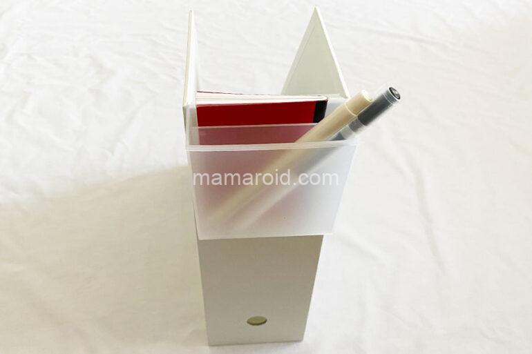 メモ帳が倒れ込まず、幅がスマートなので棚から出っ張らないところがいいですね。