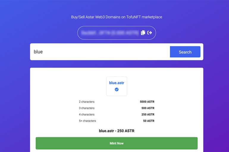 取得は、「Astar Domains」のページにいくとメタマスクとの接続ボタンがあるのでそれを押してから、取得したいドメイン名を検索。取得できる名前かどうか確認してOKなら、「Mint Now」のボタンをポチッと押すだけ。めっちゃくちゃ簡単です。