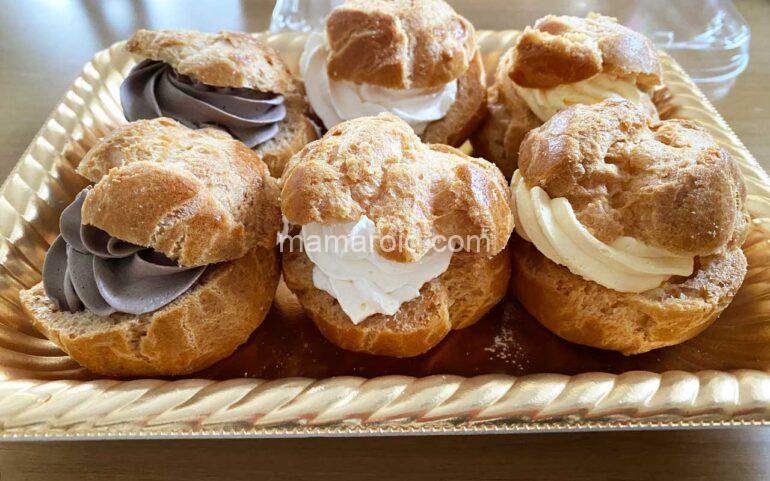 チョコレート、生クリーム、カスタードクリームの3種類の味が楽しめるプチシュークリーム。購入してみました。