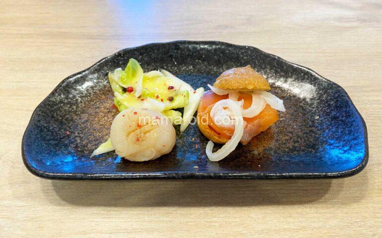 - 前菜:3種の盛り合わせ(サーモンマリネのグジェール、アンディーブの柚子ビネグレット和え、帆立のバターソテー)