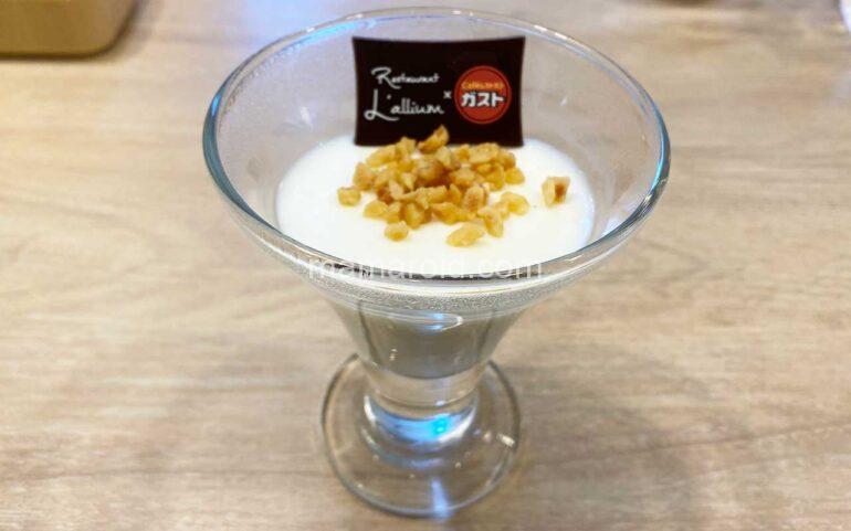 最後に提供されたデザートは、プルンとした食感のブランマンジェにヘーゼルナッツとチョコプレートが添えられた一品。優しい甘さと香ばしさが口いっぱいに広がりました。