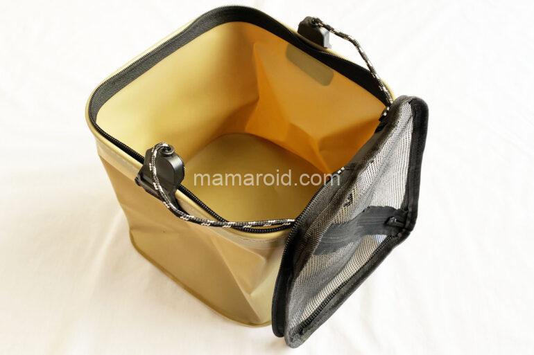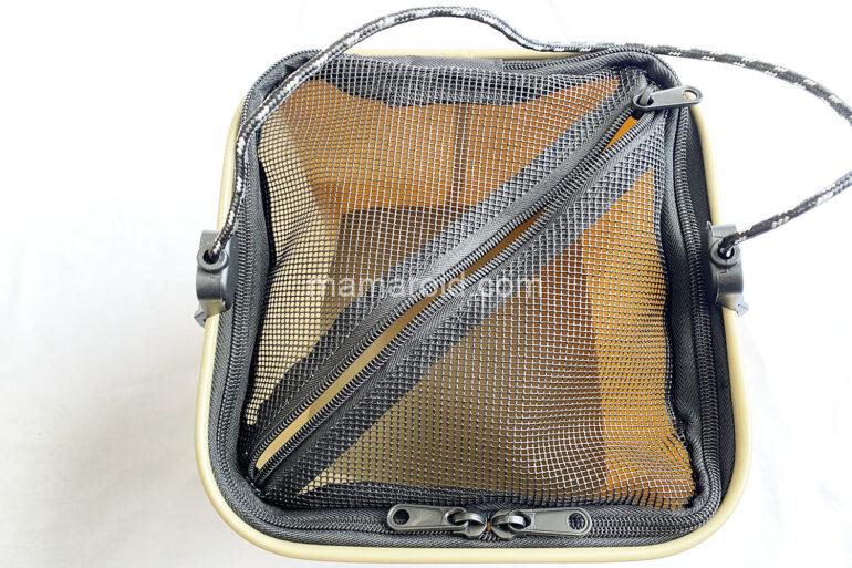 メッシュのフタをしたまま、中央斜めに開くファスナーから釣った魚を入れられます。これなら魚の飛び出しを防げますね。