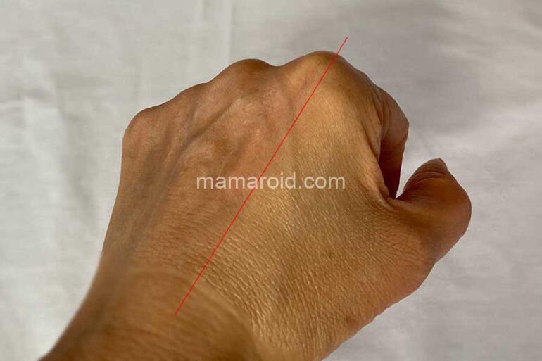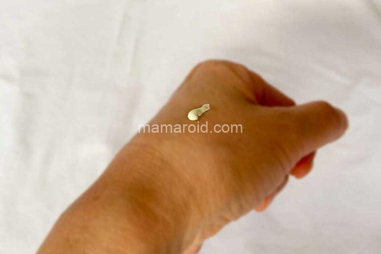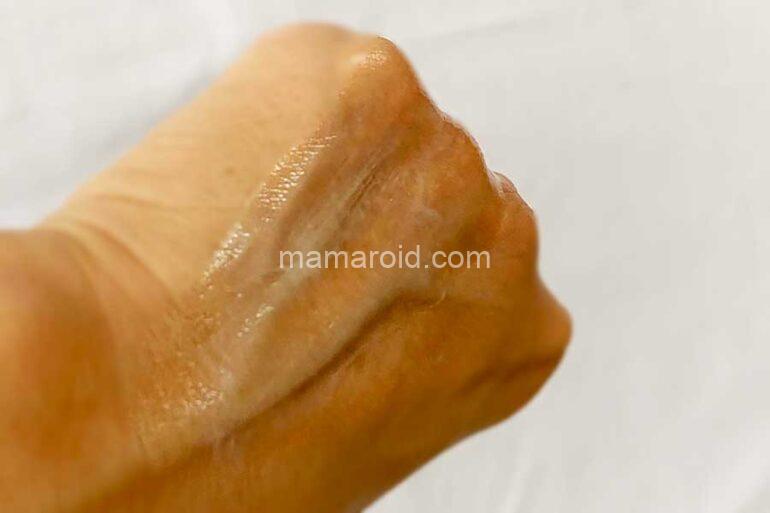 伸び感はよく、べたつきもあまり感じられません。上記写真右側が塗ったところ。