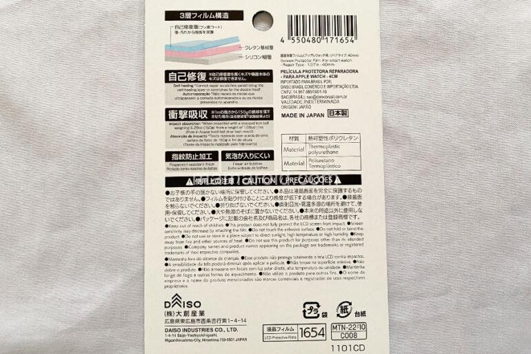 ダイソーのApple Watch用 画面保護フィルム 自己修復加工タイプは110円。ダイソーオリジナル商品で日本製です。材質は熱可塑性ポリウレタン。3層フィルム構造になっていて、フッ素コートがされている表側の層が自己修復してくれるようです。