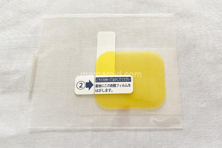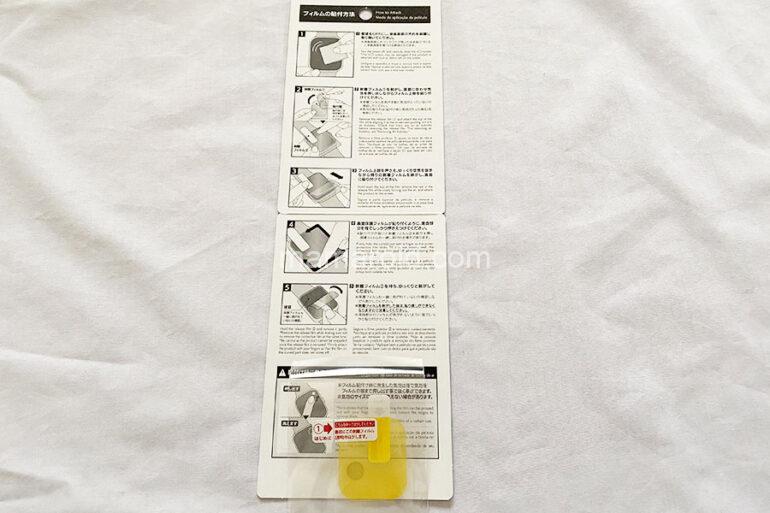 パッケージを開くと、内側には商品とともに「フィルムの貼付方法」がイラスト入りで記載されています。