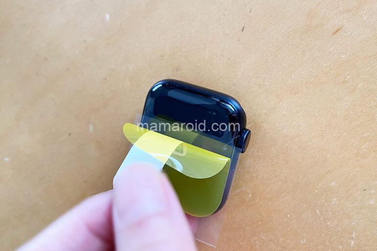貼りやすいように、シールは上部だけが剥がせるようになっていて、そこをApple Watchの画面に合わせてから、気泡が入らないように全体に貼るイメージです。スマホではよくあるパターンですね。