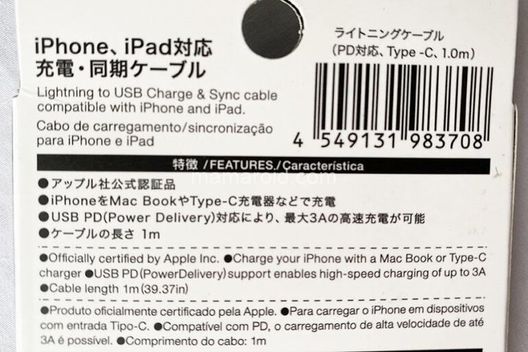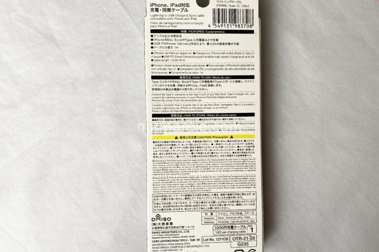 Apple社公式認証品の「ライトニングケーブル」はダイソーのオリジナル商品で、価格は1,100円。
