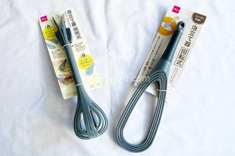 泡だて器は我が家にもあります。お菓子づくり等をほぼやらないため、引き出しにストックされている時間が長いキッチングッズの1つなんですが、時折引っかかったりしてなかなかの邪魔モノ。その不満を解消してくれる泡だて器が2種類ダイソーから登場しました。