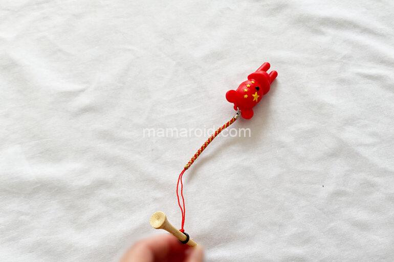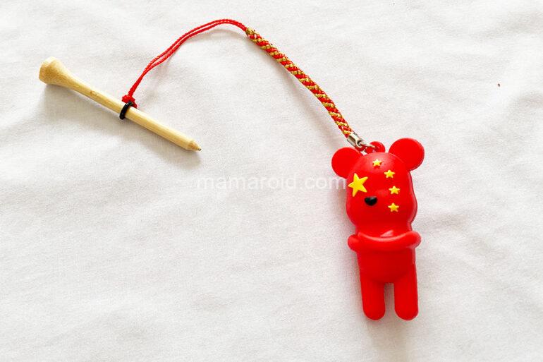 この可愛らしいクマちゃんは、何者かというと、ゴルフのティーが飛んでなくならないようにするためのグッズ。ティを差し込んで使います。