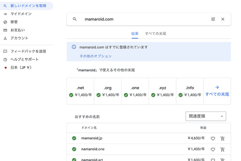 新しいドメイン名が取得できるかどうかは、下記から確認できます。