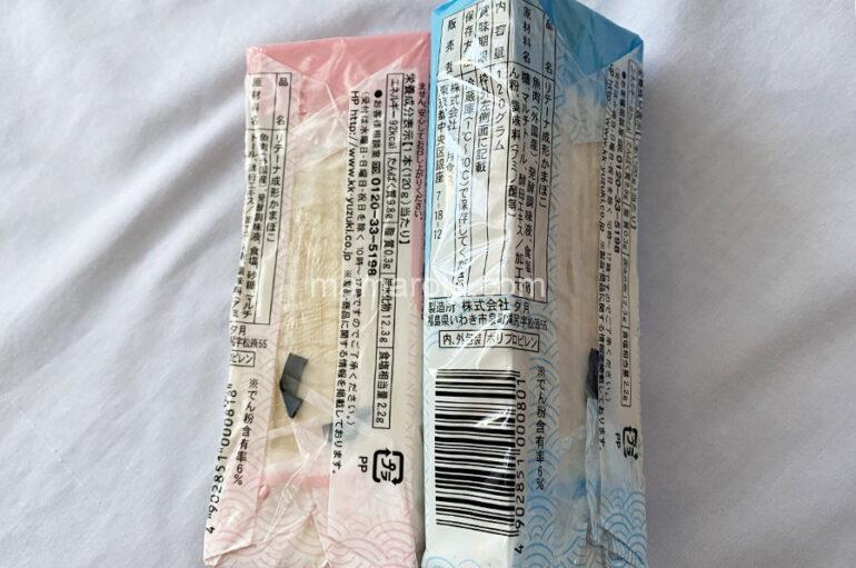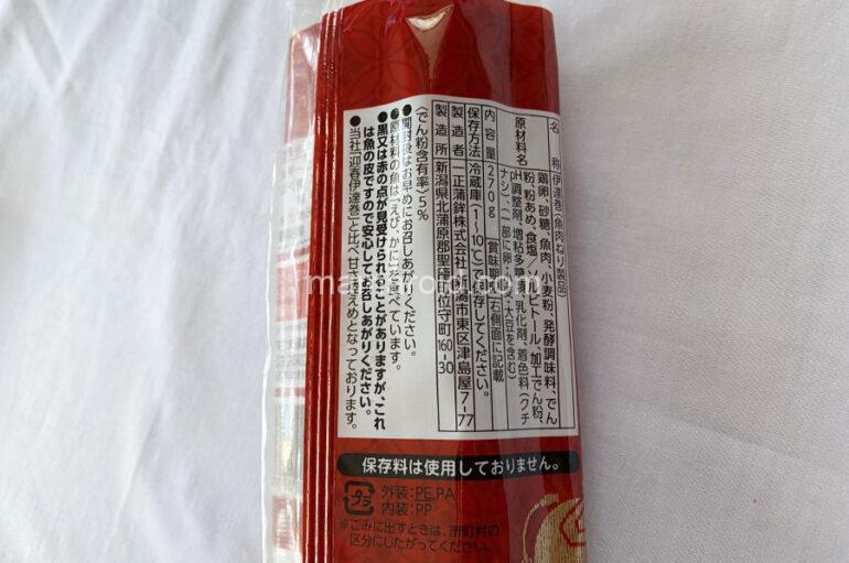 原材料は魚肉(外国産)、発酵調味液、食塩、砂糖、マルチトール、酵母エキス/加工澱粉、調味料、着色料(ラック)、PH調整剤、ミョウバン。