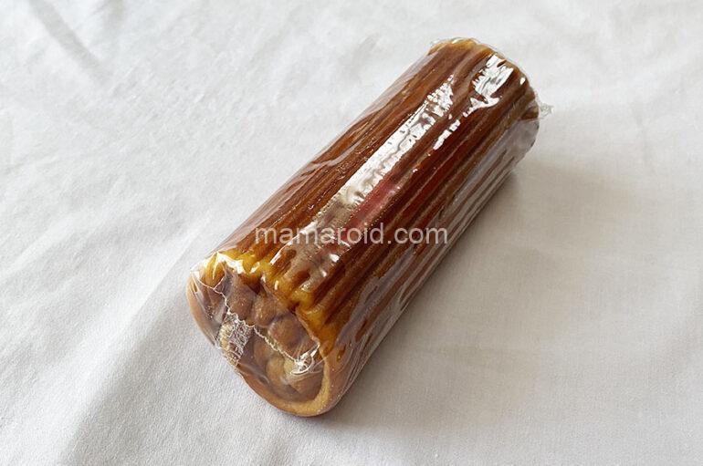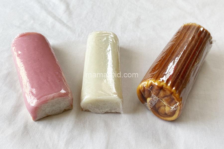 原材料は鶏卵、砂糖、魚肉、小麦粉、発酵調味料、澱粉、粉あめ、食塩、加工澱粉、PH調整剤、増粘多糖類、乳化剤、着色料(クチナシ)。