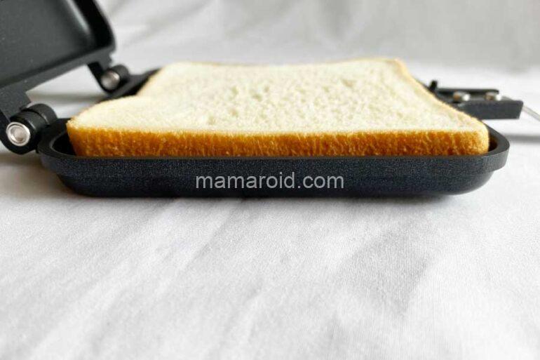 8枚切りの食パンを2枚重ねてホットサンドメーカーを閉じると、やや浮き上がり気味。