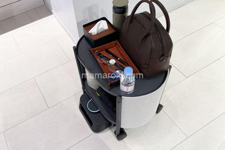 毎日帰宅時間に玄関にワゴンが来るようにセット。玄関でカバンやカギ、スマホ、財布などといったものをワゴンの定位置に置けます。これなら、置きっぱなしや「カギがどこいった?」問題もなくなります。ダンナの脱いだものを片付けるという、主婦の名もなき家事も解消できそうです。