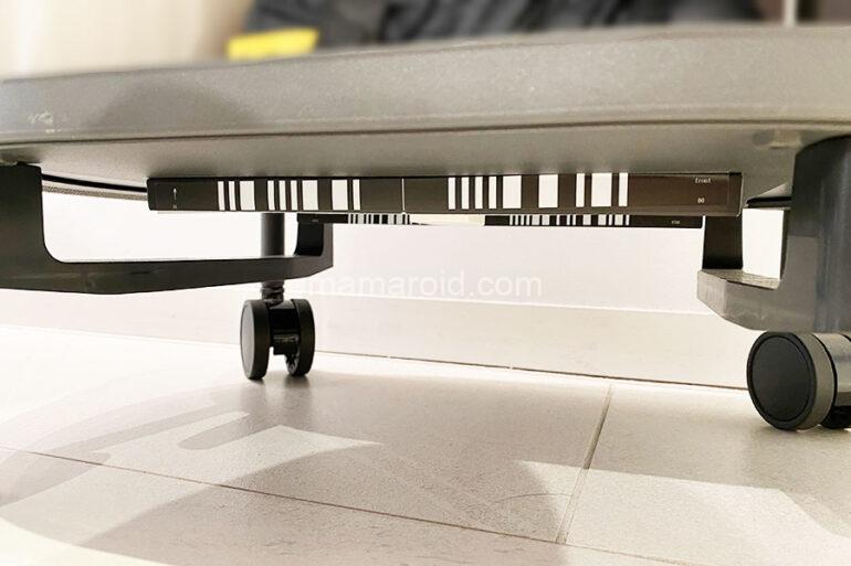 カチャカ本体が専用家具の下に潜り込んでスムーズに連結・運搬できるよう開発された、独自のドッキングユニットで家具を移動させています。家具の下にはバーコードがあり、カチャカ本体1台で複数の専用家具を認識して移動させることができるようになっています。