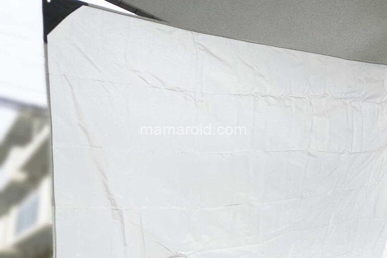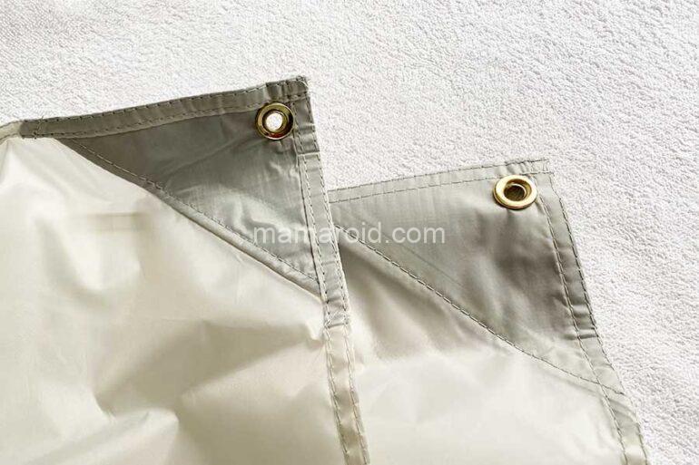 もう片方はロープのままなので、その先端をタープの四隅にうちているハトメに括り付けます。
