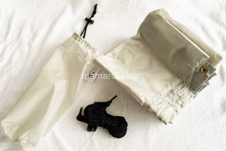 袋の中には、200×150cmのタープと195cmの自在ロープが4本入っています。