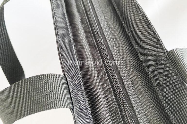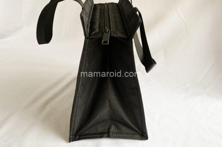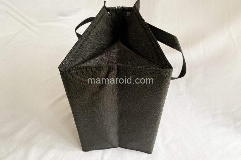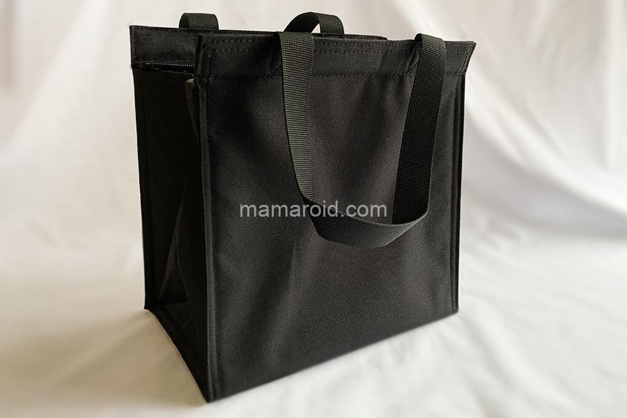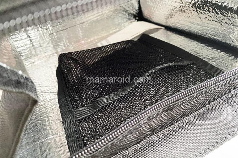 外気の影響を受けにくいよう内側にアルミシートを使い、上部にファスナーを付けました。食材が傾きにくいマチ広タイプです。内側に保冷剤を入れられるメッシュポケットがついています。