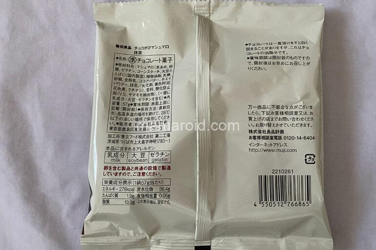 無印良品の「チョコがけマシュマロ」は57g入りで190円。抹茶の他にキャラメル、ダークがあります。