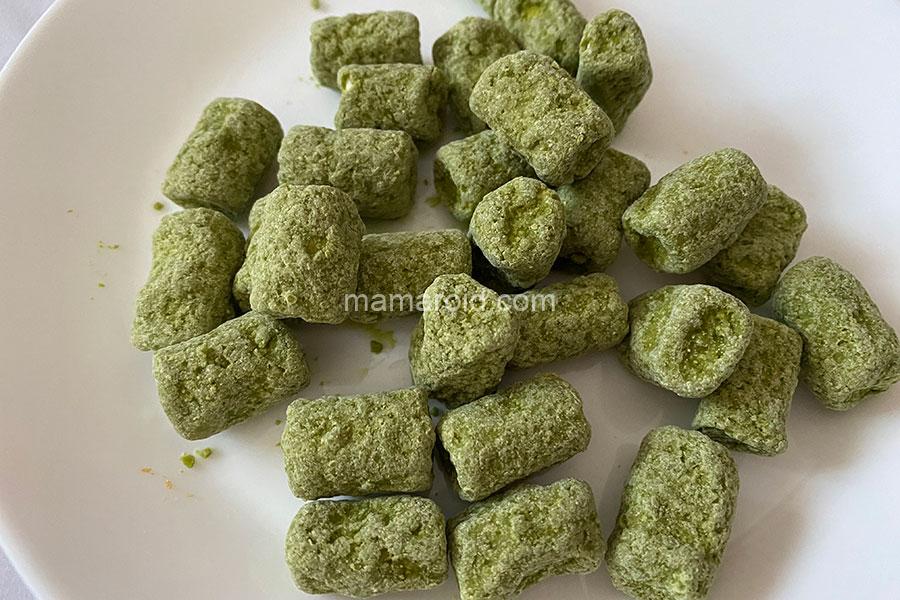抹茶は抹茶チョコでコーティングされていて、深みのある抹茶の風味と、甘すぎない優しい風味のお菓子です。