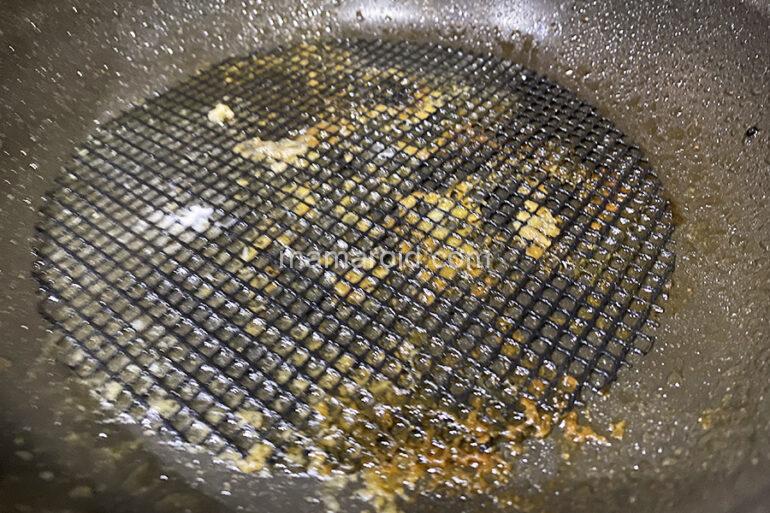 このこびりつき、ネットであるゆえに、フライパンより落としにくい。