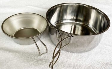 直火OKな100均ステンレス製キャンプグッズ「折りたたみ手付き鍋」「シェラカップ」