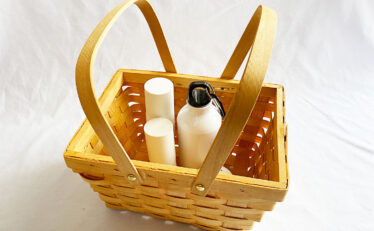 ダイソー「スライスウッドバスケット」グリーンや小物の見せる収納に