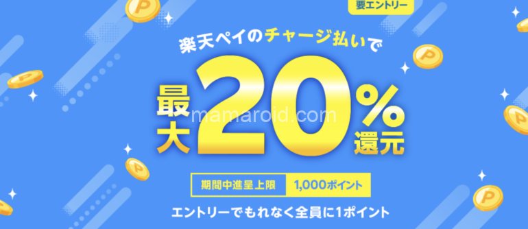 「楽天キャッシュでのコード・QR払いで最大20%還元!」にエントリーするともれなく楽天ポイントが1ポイントがもらえます。