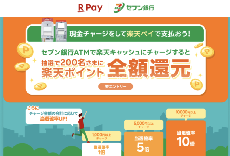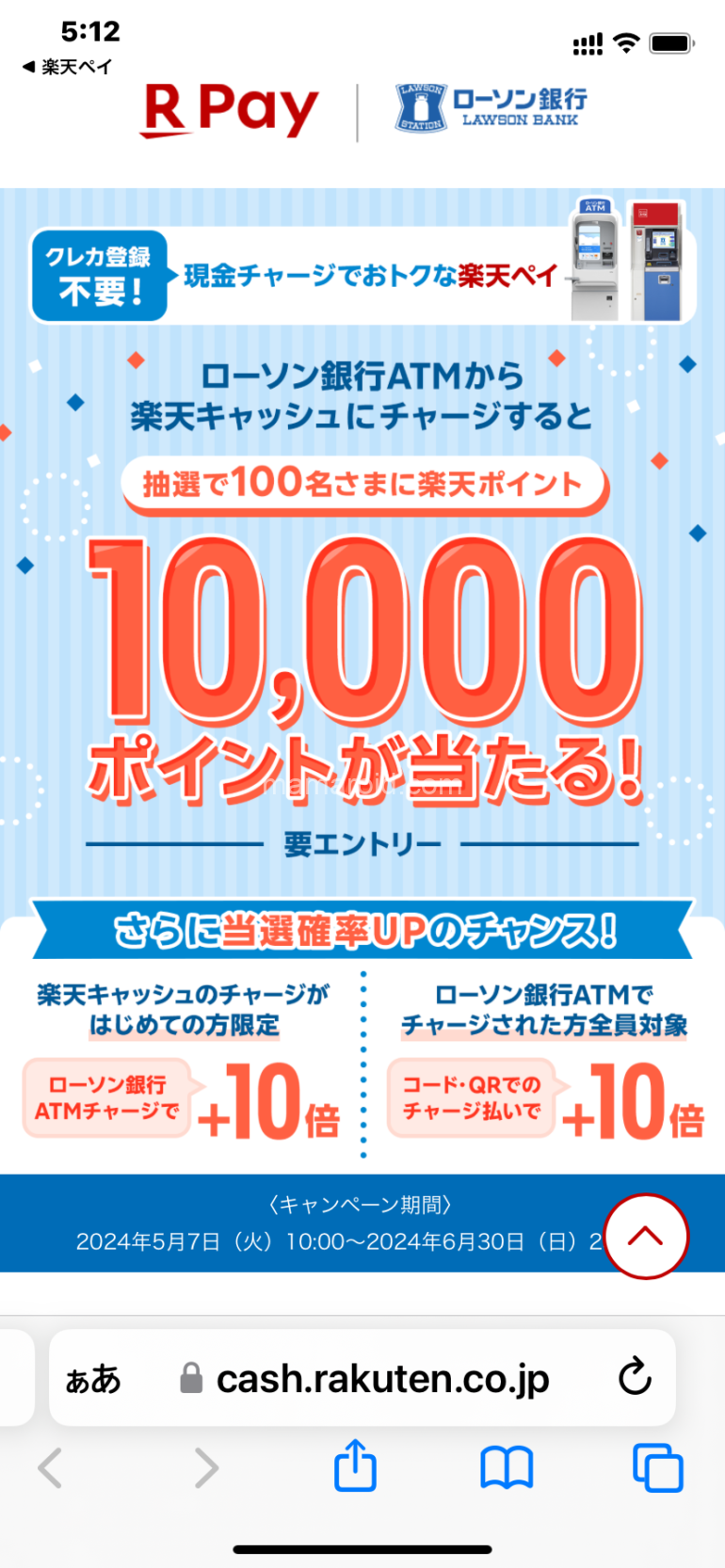 ローソン銀行のATMから楽天キャッシュにチャージで10,000ポイントがあたる!キャンペーンも実施中です。〜6月30日まで。エントリーが必要です。