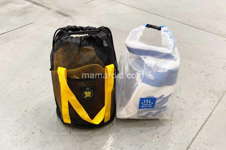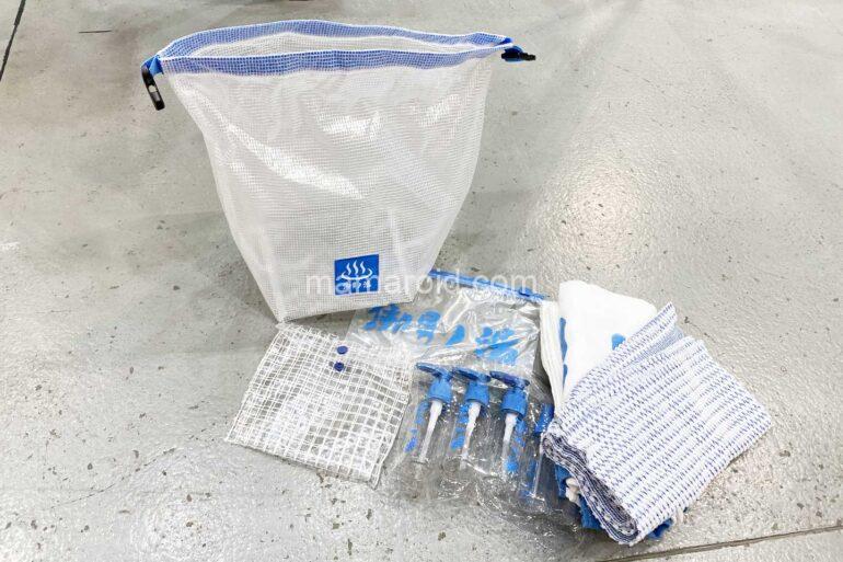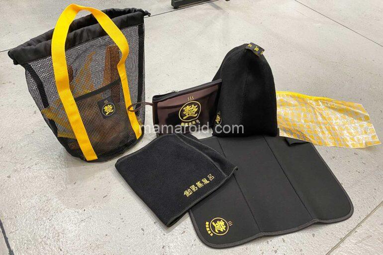 外バッグがなかなかいい感じで、サウナハットやタオル、ポーチ、シートなどがついています。