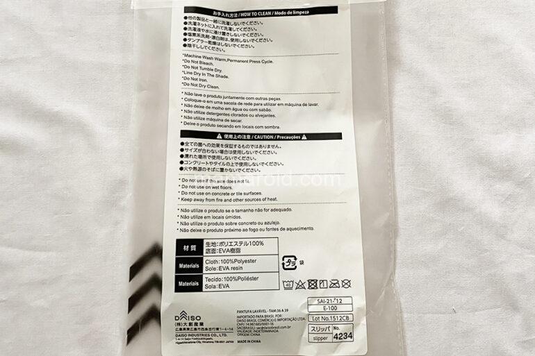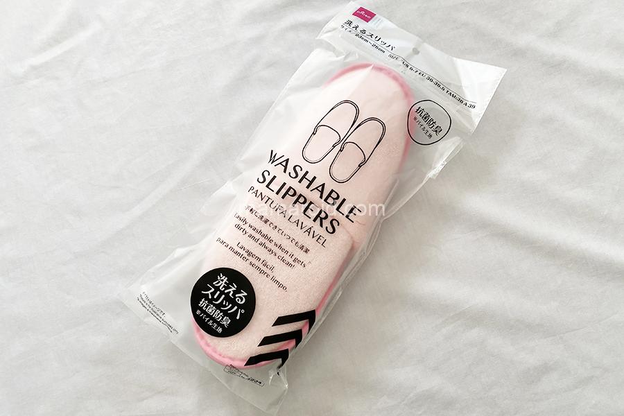パッケージデザインに100円ショップ臭さがなく、また全容がわからないようにパッケージされているところも相まって、ちょっぴり期待して「洗えるスリッパ」を購入しました。