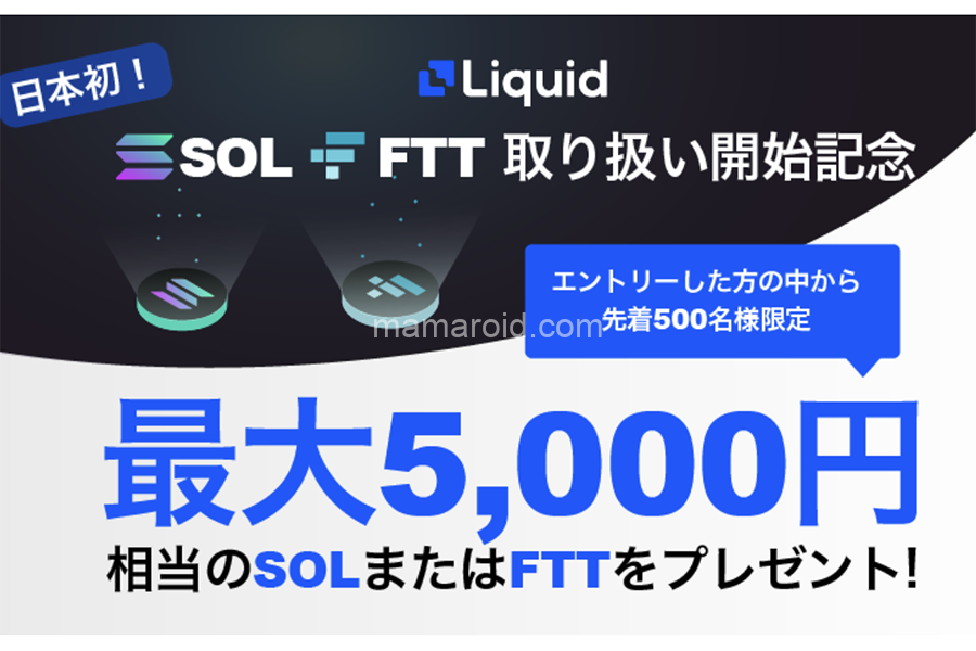 Liqiud(リキッド)では、エントリーフォームから申し込みした先着500名に、クイック販売所で最初に購入したSOLまたはFTTの数量の20%分をプレゼントするキャンペーンを実施しています。