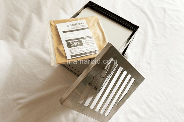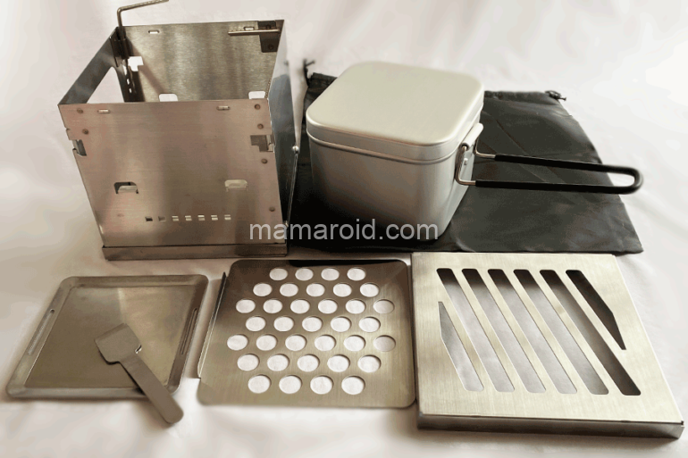 メスティン、ミニ鉄板、焼き網などは100均でも扱っている商品。物珍しさはないので、この商品を購入するメリットはひとつにまとめて収納できるところ。