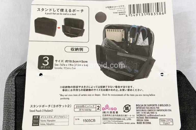 ダイソーの「スタンドポーチ(3ポケット2)」は220円。卓上の小物をまとめて収納でき、使うときにはそのまま立てて使えるところが特徴の商品です。