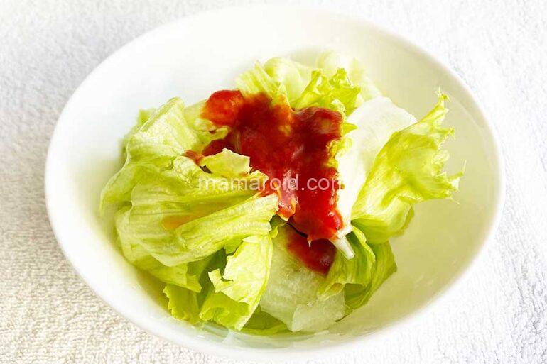 でも食べてみると、シンプルなフレンチドレッシングにケチャップが入っている感じ。お酢とコショウとのあとに、トマトケチャップがやってくるような感じです。甘いトマトをピューレ状にすると、どうしてもケチャップイメージに近づいちゃいますね。今更ながら、ケチャップ偉大!
