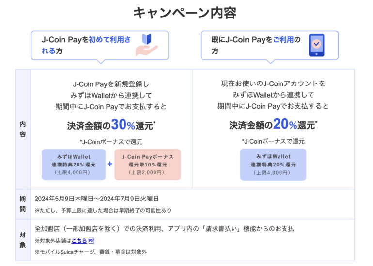 J-Coin Payを新規登録し、みずほWalletから連携して、期間中にJ-Coin Payでお支払すると決済金額の30%が還元されるというもの。「J-Coin Pay ボーナス還元祭」による還元と「みずほWallet」連携特典をあわせてJ-Coinボーナス還元率が合計最大30%(10%+20%)で、還元上限は2,000円となっています。