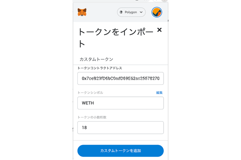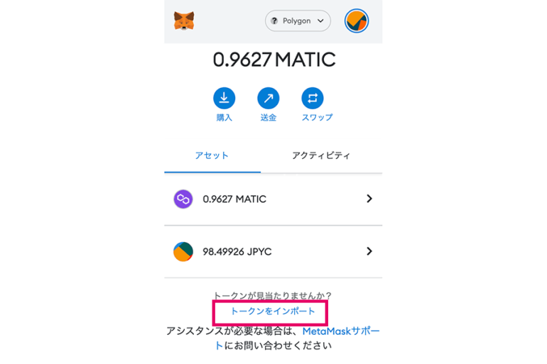 1、メタマスクを開きpolygonネットワークに接続し「トークンの追加」をタップ