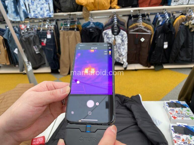 3つ目は着るコタツ、ヒーターウエアのコーナー。スマホにサーモグラフィーのアダプターをつけて、あっという間に温まる温度変化を見せてくれました。