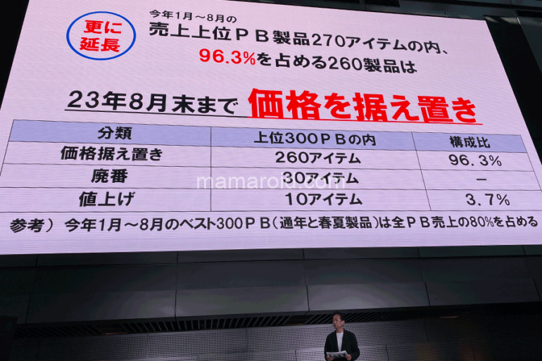 端的に言えば、価格据え置き宣言。今秋だけではなく、来年2023年8月までPBの主力製品のほとんどの価格を据え置き、値上げしない、という内容でした。
