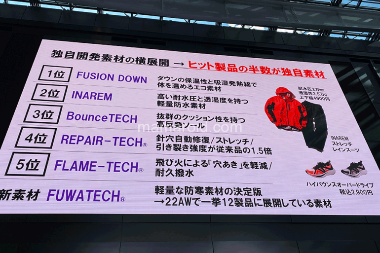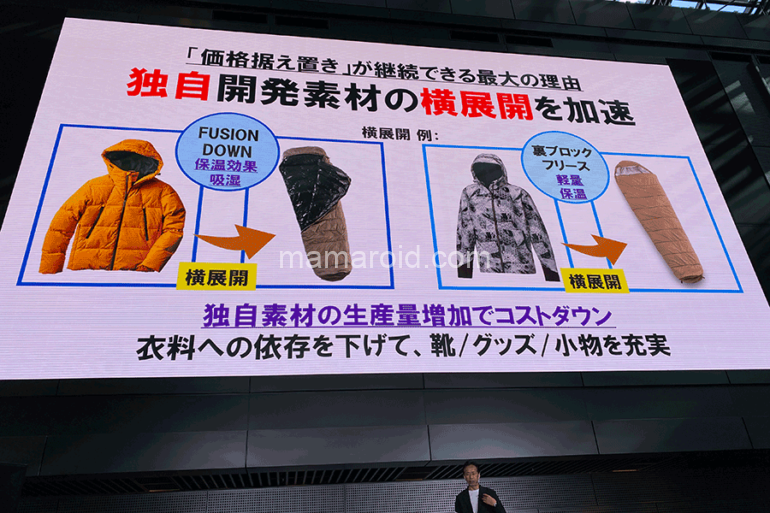 価格を据え置くために、ワークマン独自の素材や加工方式を多くの商品に流用し、数を増やすことで単価を下げる工夫をしていえるのだとか。