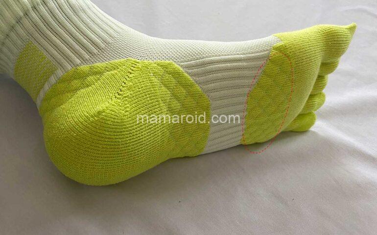 特殊な形のクッションパイルは、指で押すと一定の抵抗力を感じながらもふわっと沈む感触。このぼこぼこは、足首後ろ側にもついていて、靴づれ防止にもなりそうです。