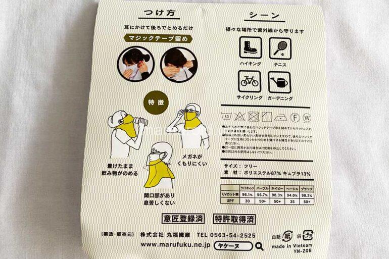 サイズはフリーで、素材はポリエステル87%キュプラ3%。UPF50+。